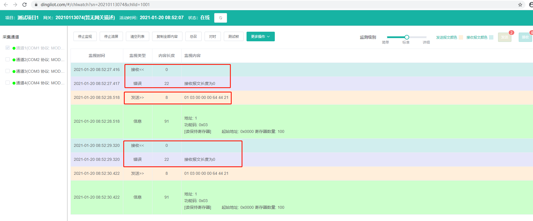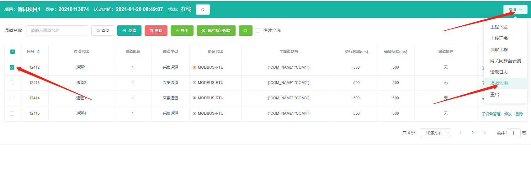 2、釘工云,打開網關列表->組態,在采集通道服務的通道管理界面,選中要查看的通道,點擊右上角的操作->通道監測,跳出通道監測報文界面,可查看到數據發送與接收過程。